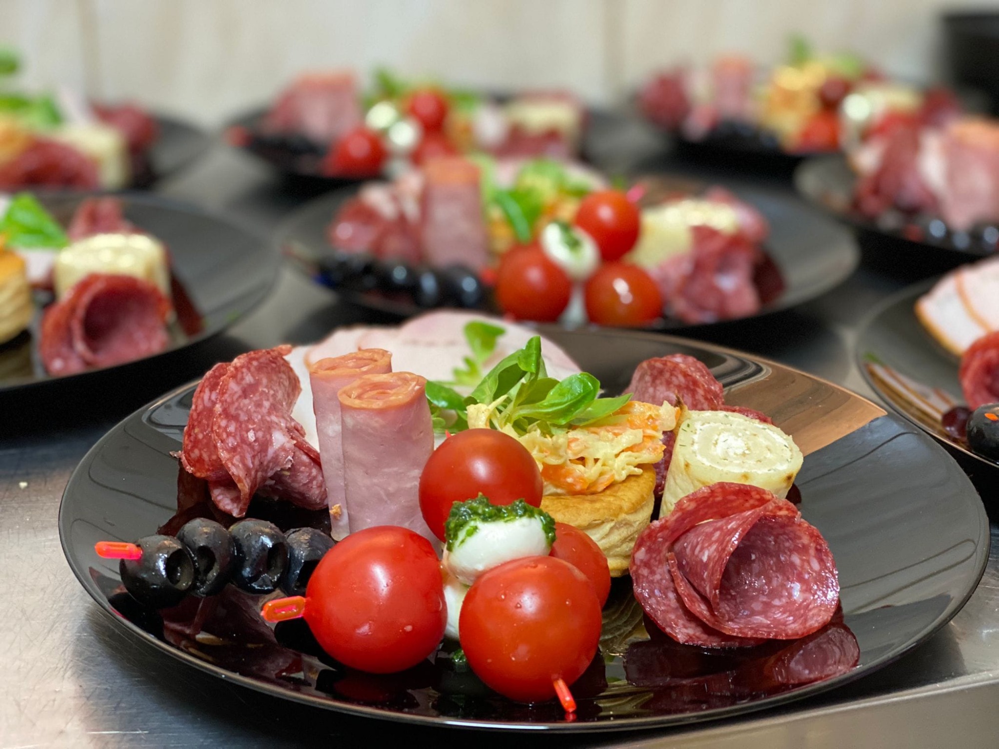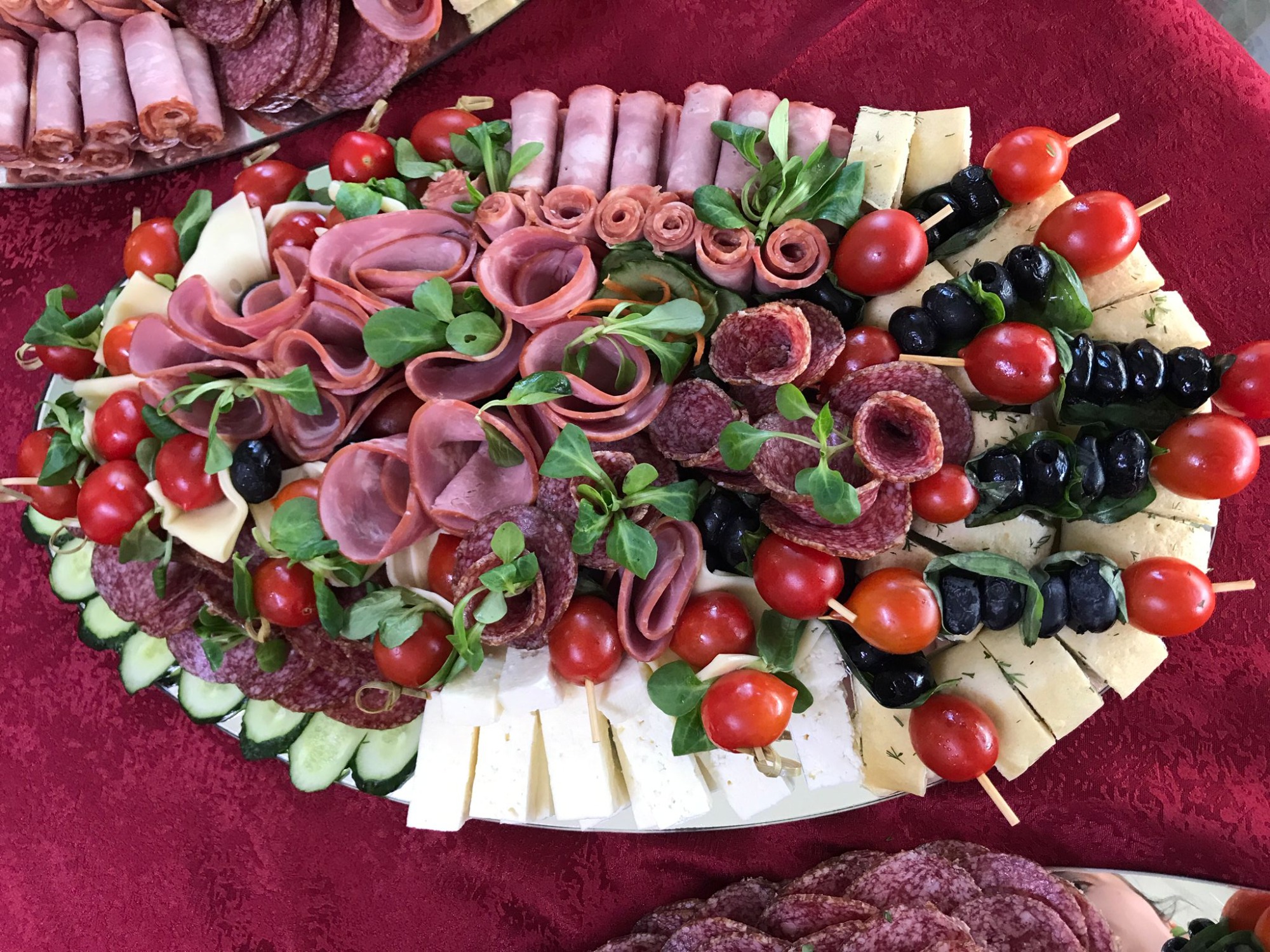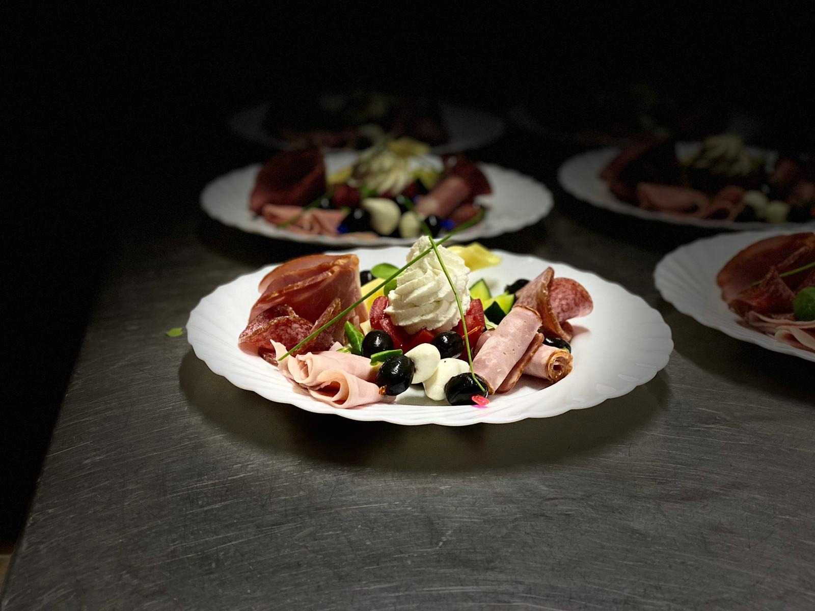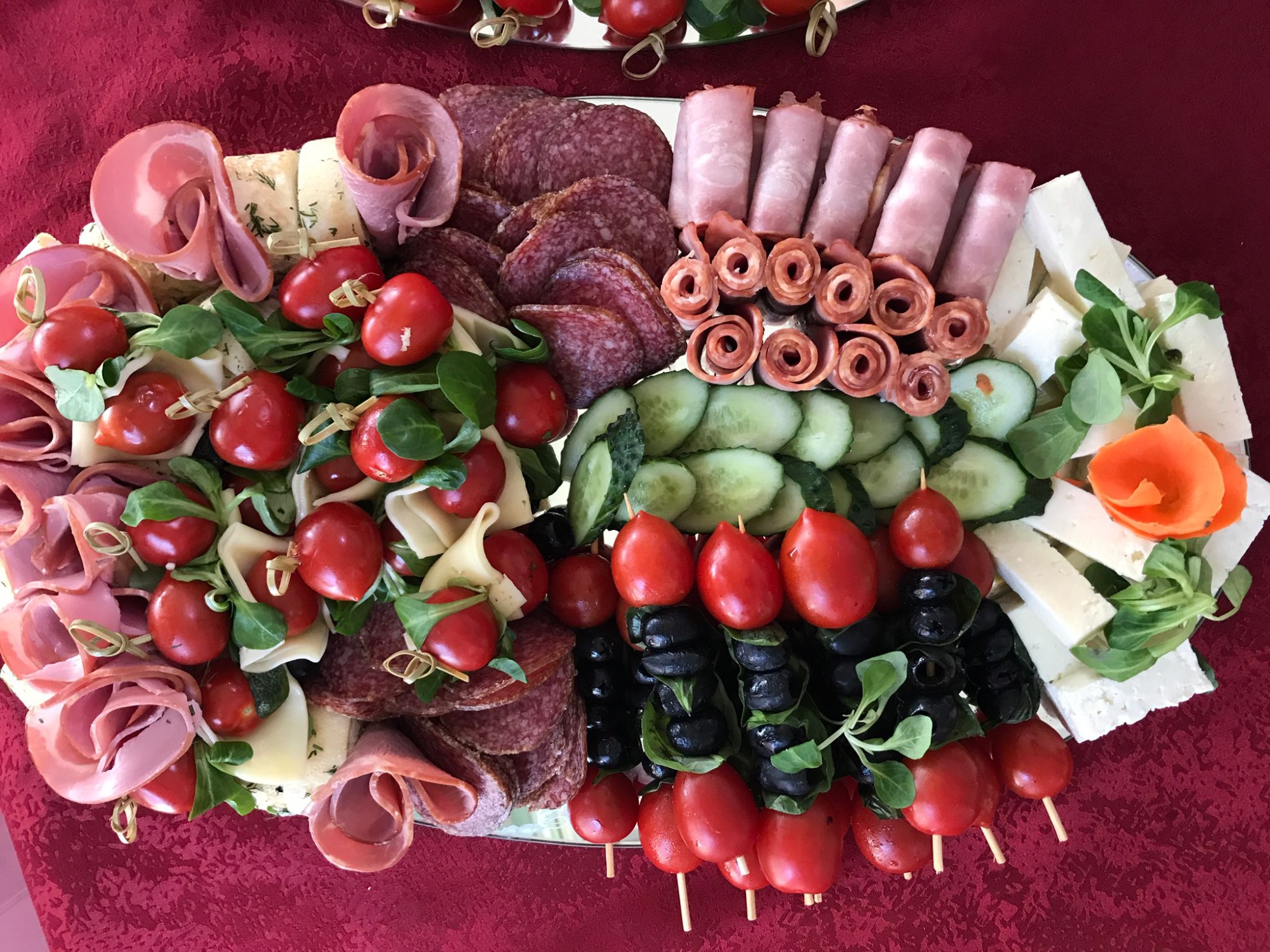 salam de sibiu, mușchi țigănesc de la meda, bacon, frigărui de bocconcini cu roșii cherry, cașcaval, măsline, castraveți -